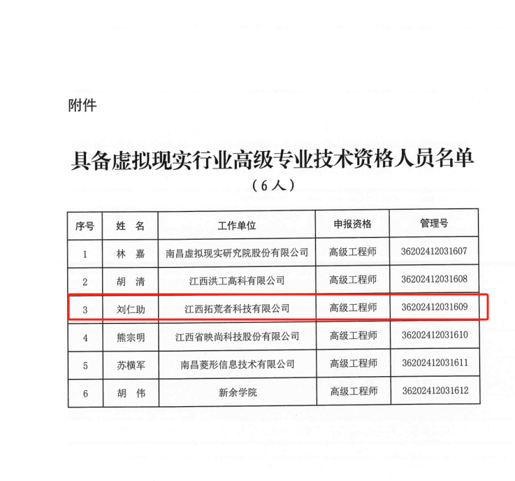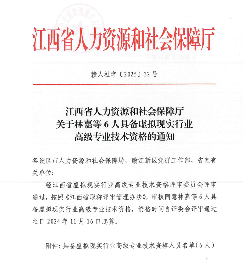 近日,江西省人力資源和社會保障廳發布《關于林嘉等 6 人具備虛擬現實行業高級專業技術資格的通知》(贛人社字〔2025〕32 號),江西拓荒者科技有限公司總經理劉仁助順利通過評審,獲得虛擬現實行業高級工程師資格,資格自2024年11 月16 日起生效。