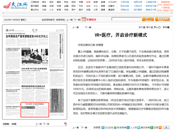1、江西日報2版報道《基于VR技術(shù)的康復(fù)評定與訓(xùn)練系統(tǒng)裝置》,這是今年下半年該項目公司第三次接受新聞媒體的報道